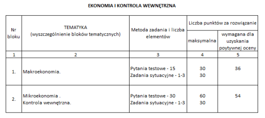 Egzamin podzielony jest na 2 bloki tematyczne i składa się z 45 pytań testowych (15 pytań z bloku mikroekonomia i 35 pytań z bloku Makroekonomia i kontrola wewnętrzna) oraz z zadań sytuacyjnych (I i II blok – od 1 do 3 zadań). Czas trwania egzaminu wynosi 2 godziny.